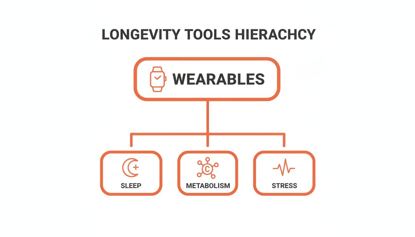 The diagram below really shows how a quality wearable pulls all this together, acting as a central hub for monitoring the core pillars of longevity—stress, sleep, and metabolism.